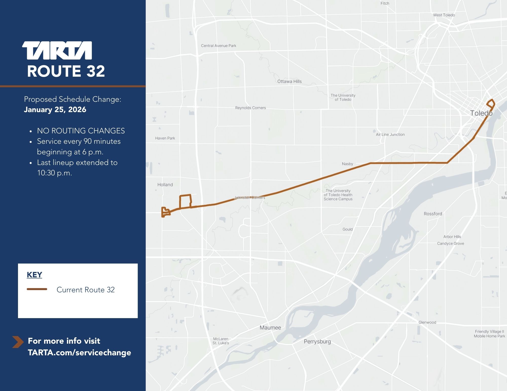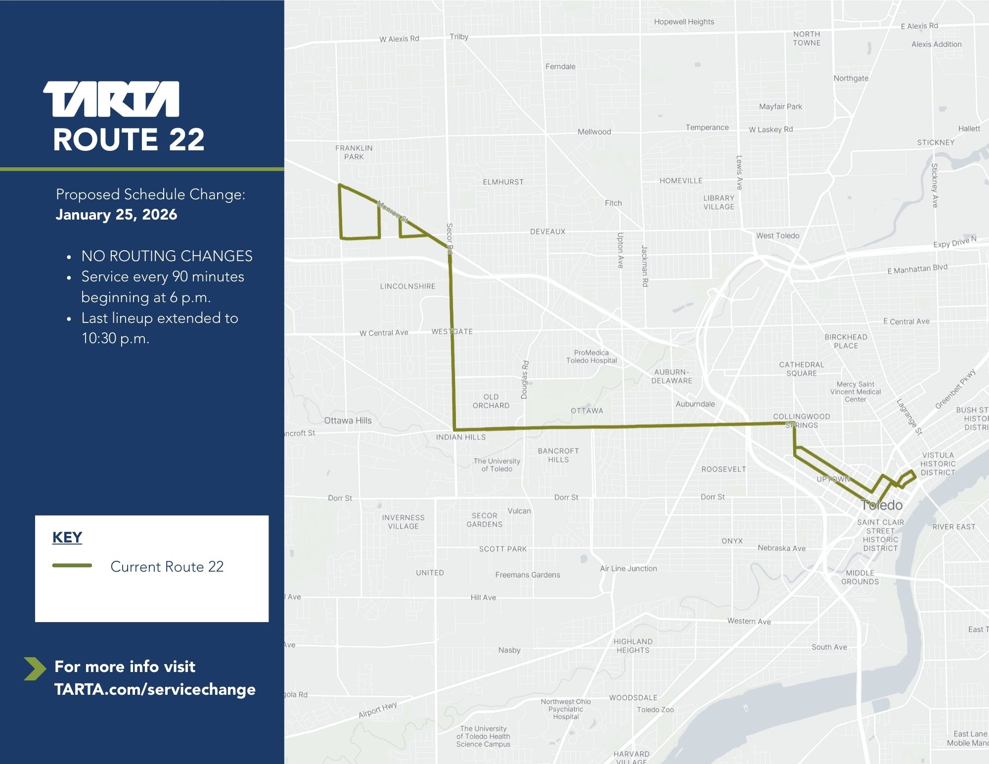 - The extension of both fixed route and TARTA Move paratransit service stop time, from 10:49 p.m. to 11:19 p.m.